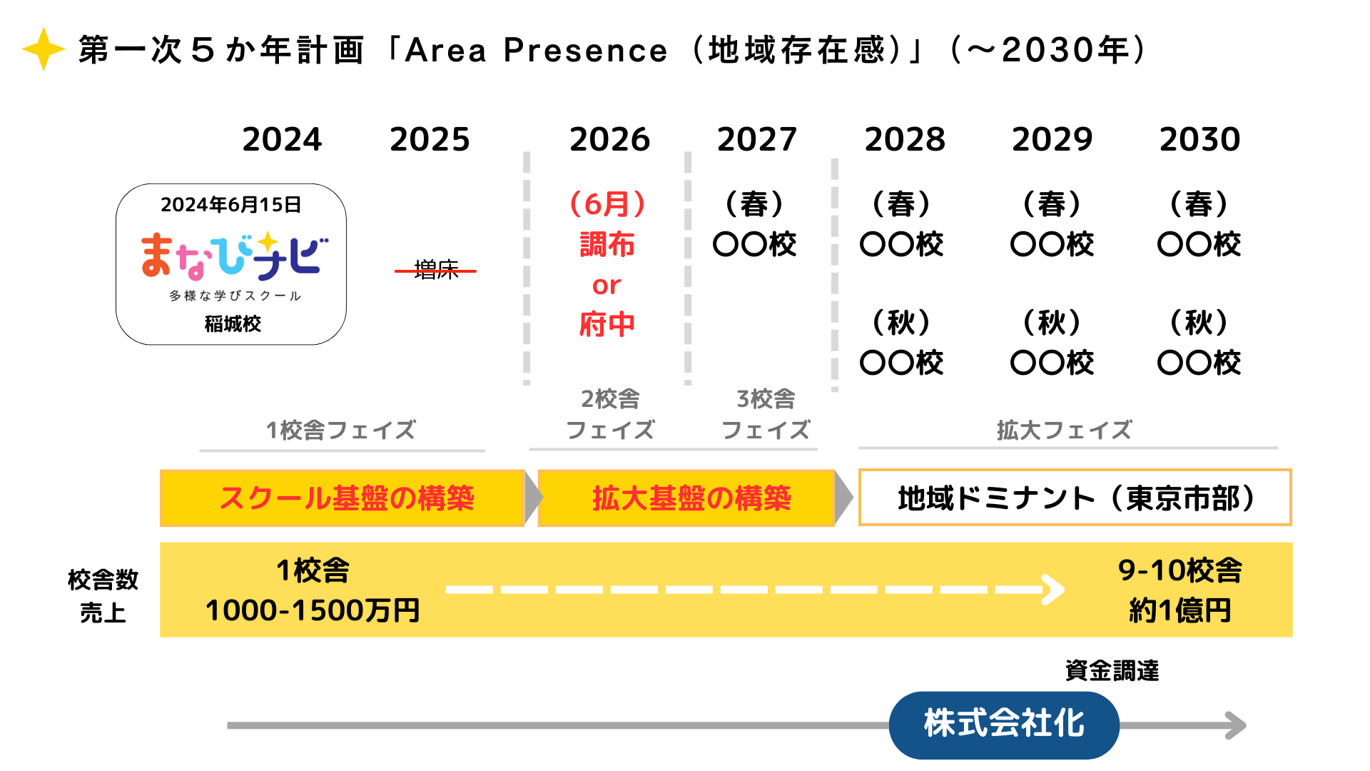 ~2030年までの5か年のテーマは「Area Presence(地域存在感)」です。多様な学びスクール「まなびナビ」の校舎展開を通して、地域での存在感を高めていくことを目指します。
