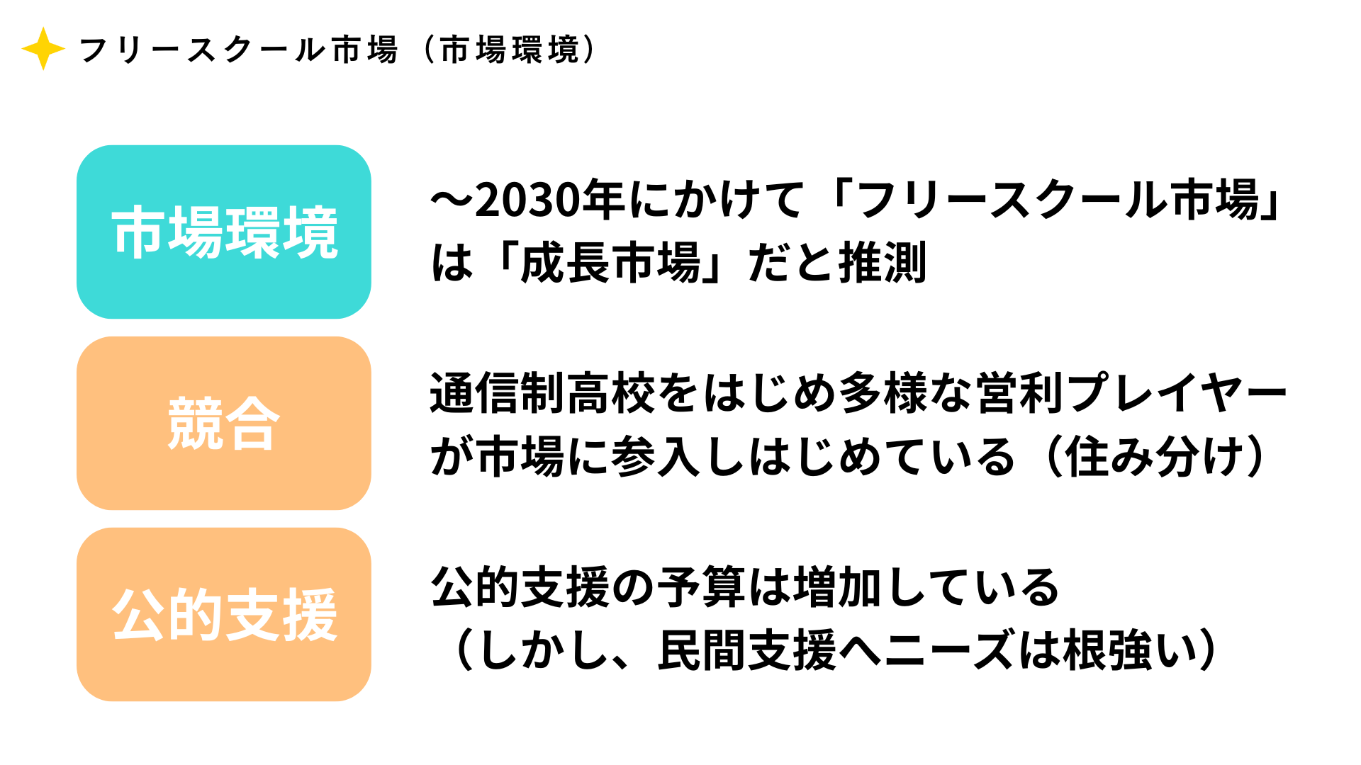 ~2030年にかけてフリースクール市場は「成長市場」と予測しています。不登校児童の増加により民間支援へのニーズは高まっていくと見込んでいます。